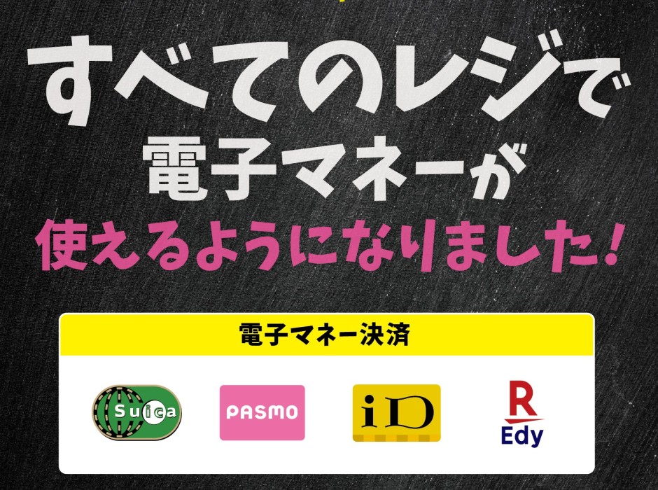 電子マネーがすべてのレジでお使いいただけるようになりました。