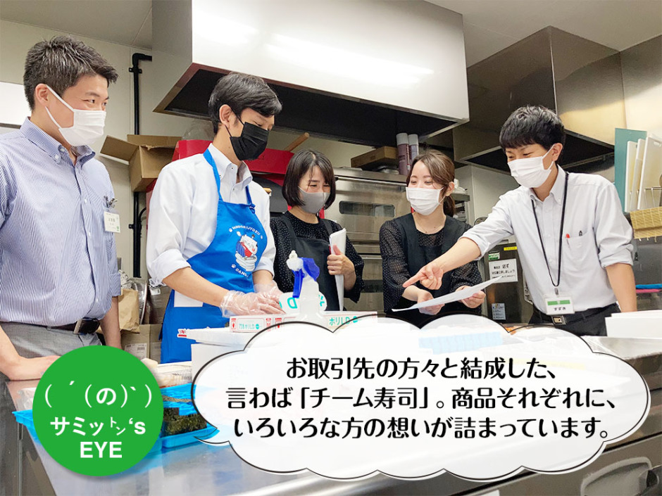 鈴木「お寿司の原材料を取り扱う会社の方々です。色々な寿司ネタ、海苔、調味料、お米…。たくさんのメンバーが一緒に商品開発するんですよ。それこそワンチームとして案を出し合います。