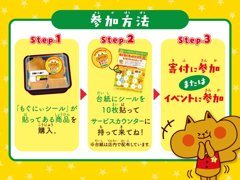 賞味期限・消費期限がせまってきた商品に「もぐにぃシール」を貼って、シールを目印に期限がせまった商品を先に買ってもらうことで、売れ残って捨ててしまう食品を減らす取組みです。また、シールを集めることで、『寄付活動』や『イベントに参加』することができるんですよ♪