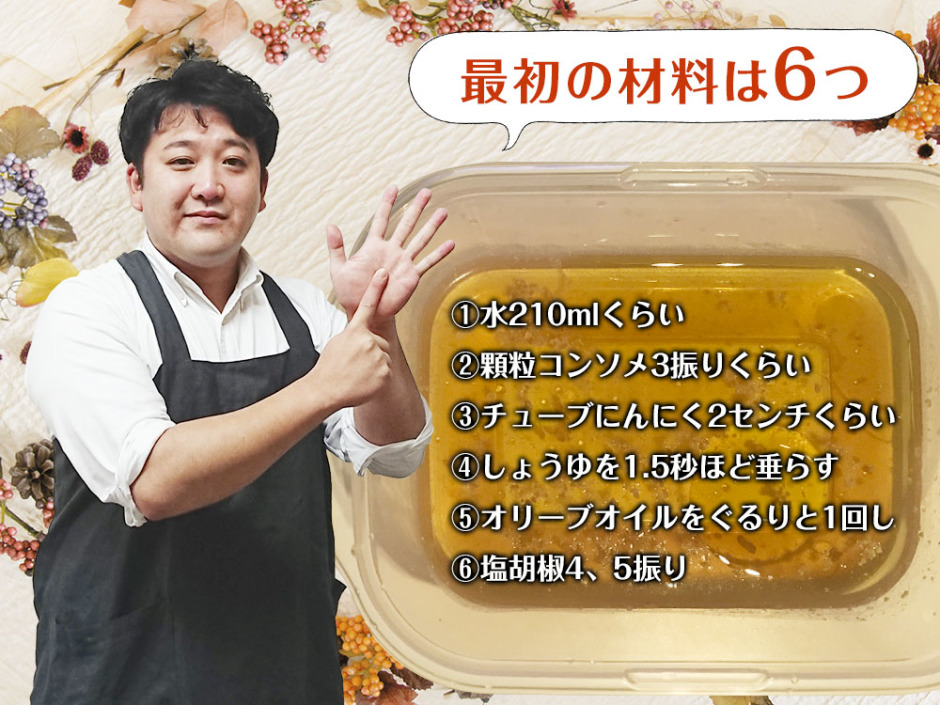 耐熱容器に、パスタに吸わせる液を①〜⑥の順に入れていきます