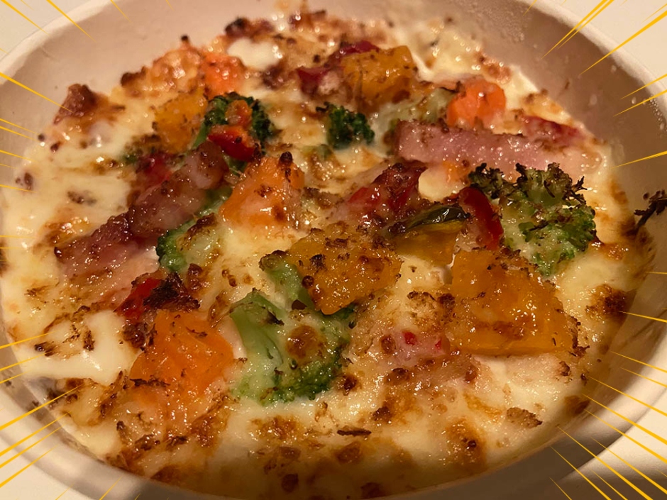 野菜もブロッコリーはシャキっと、かぼちゃはホクッと、柔らかな甘い人参が優しく、赤ピーマンは主張しすぎない食感を与えてくれます。野菜だけじゃなくベーコンも入っていて、旨みのバランスが絶妙!