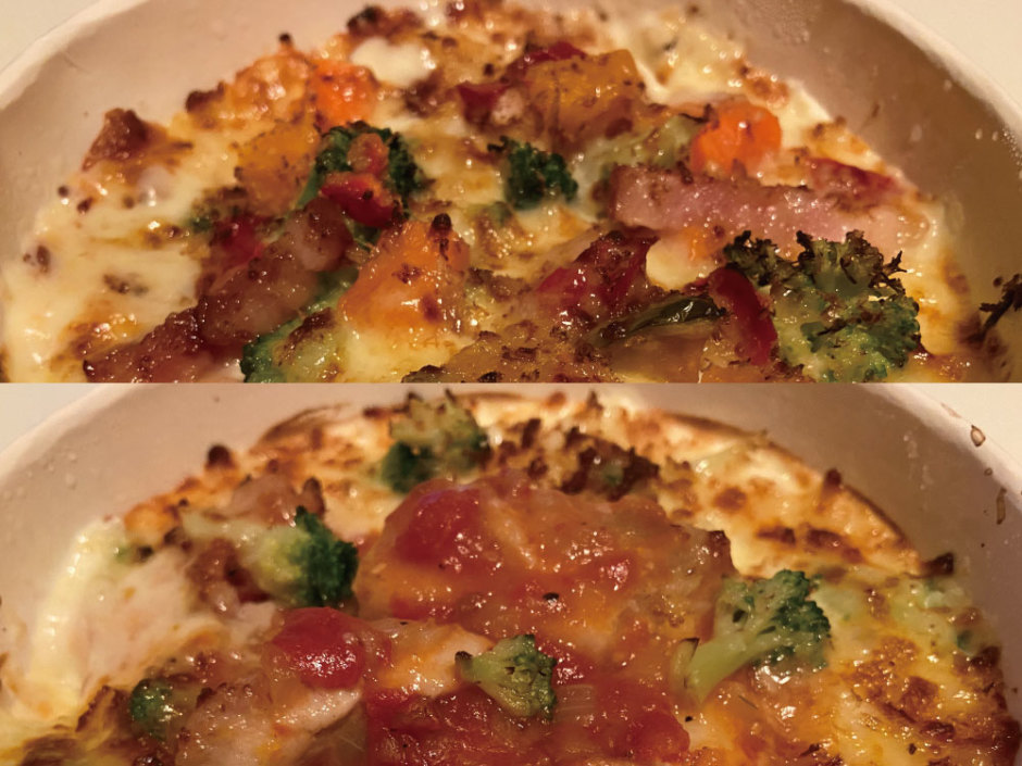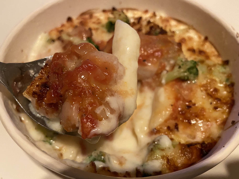 では、次は『チキンとトマトソースのグラタン』。いただきます!